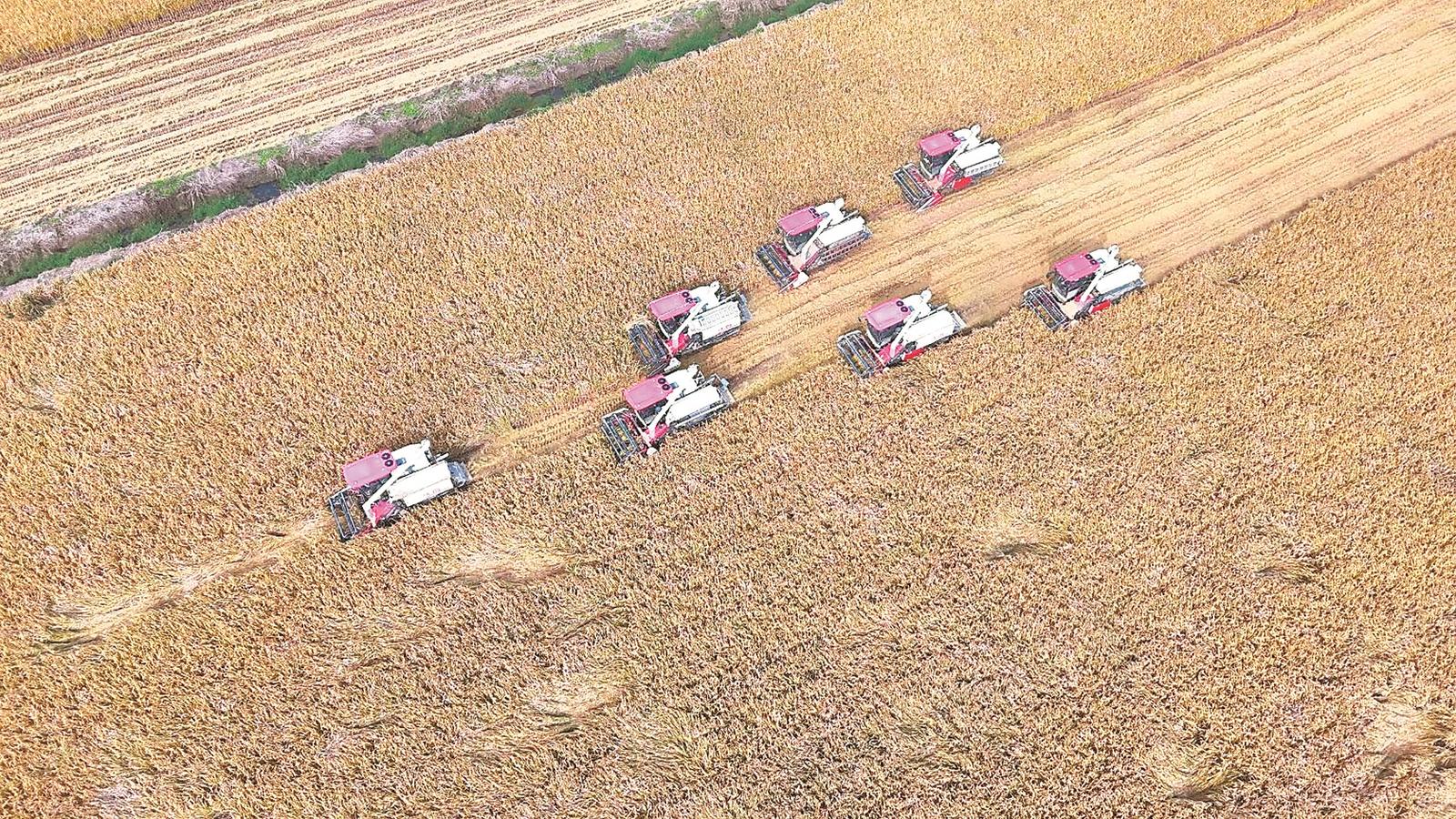 10月29日拍摄的安徽农垦集团寿溪湖农场水稻收割现场。10月29日,在寿县的安徽农垦集团寿溪湖农场,风中未形成的金色稻浪,许多农作物正在全力奔跑,穿梭回田间,形成一张巨大的丰收照片。今年夏季,寿溪湖农场共种植大豆4.8万公顷,水稻5000公顷。大豆收割工作已基本完成,水稻收割工作正在进行中。省农业农村厅数据显示,截至10月30日15时,全省粮食收获面积已达近6000万公顷,收获进度超过90%。其中,正稻收获面积超过2900万公顷,进度超过90%,玉米、大豆收获已完成。 (记者罗光新、徐浩杰 摄/文)
